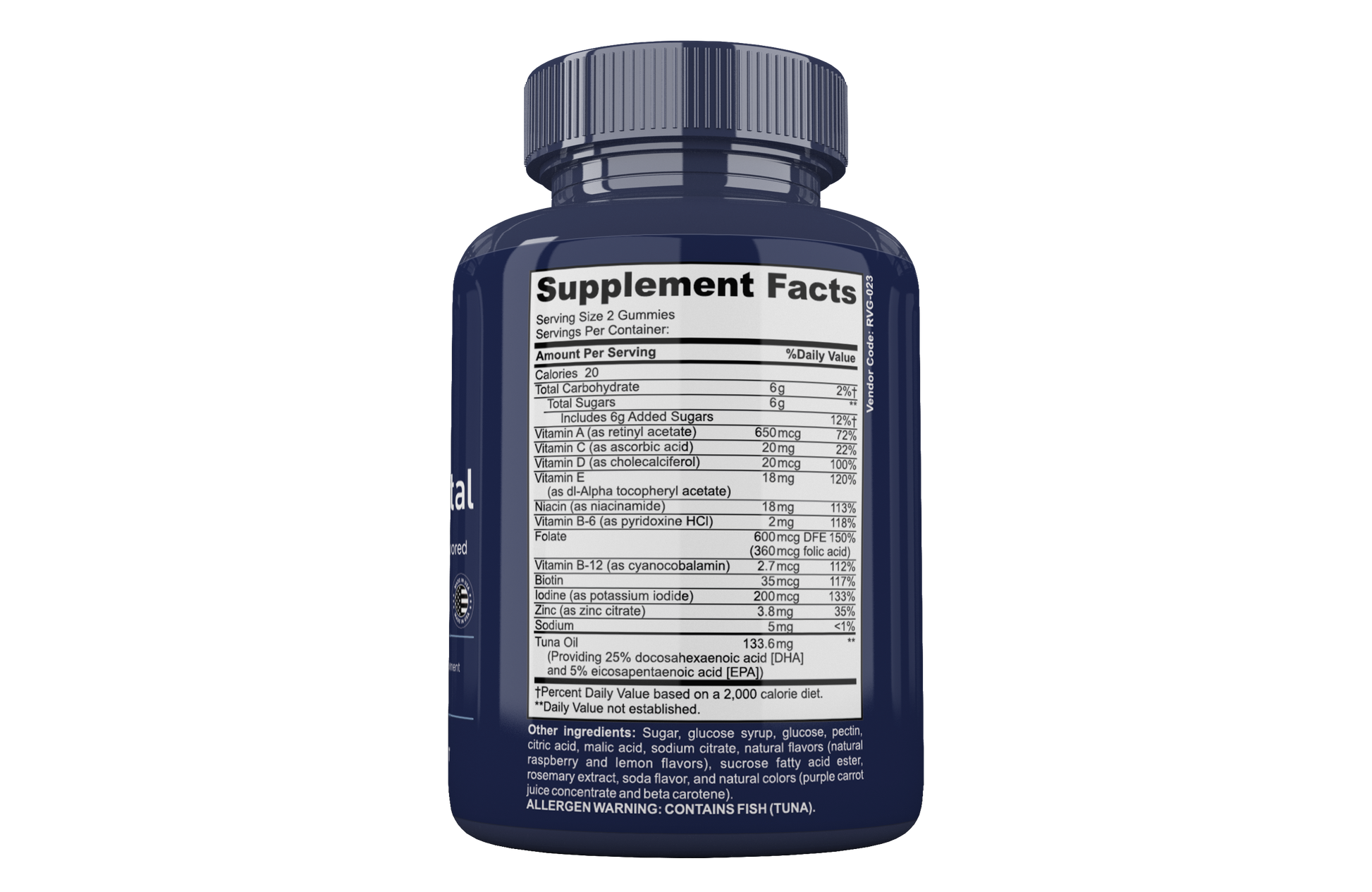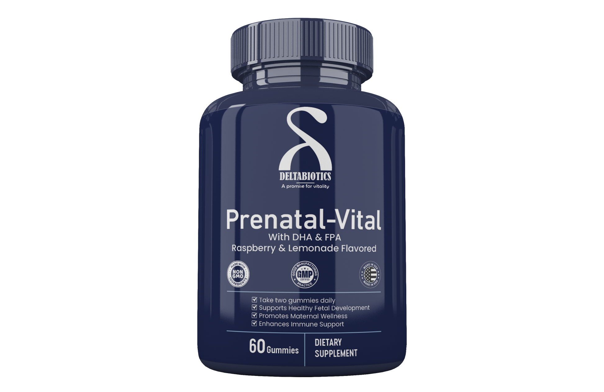 Make your prenatal routine simple (and tasty). Prenatal-Vital is a raspberry- and lemonade-flavored gummy supplement with essential vitamins, minerals, and omega-3s (including DHA) to support maternal nutrition and healthy baby development as part of a balanced diet.*